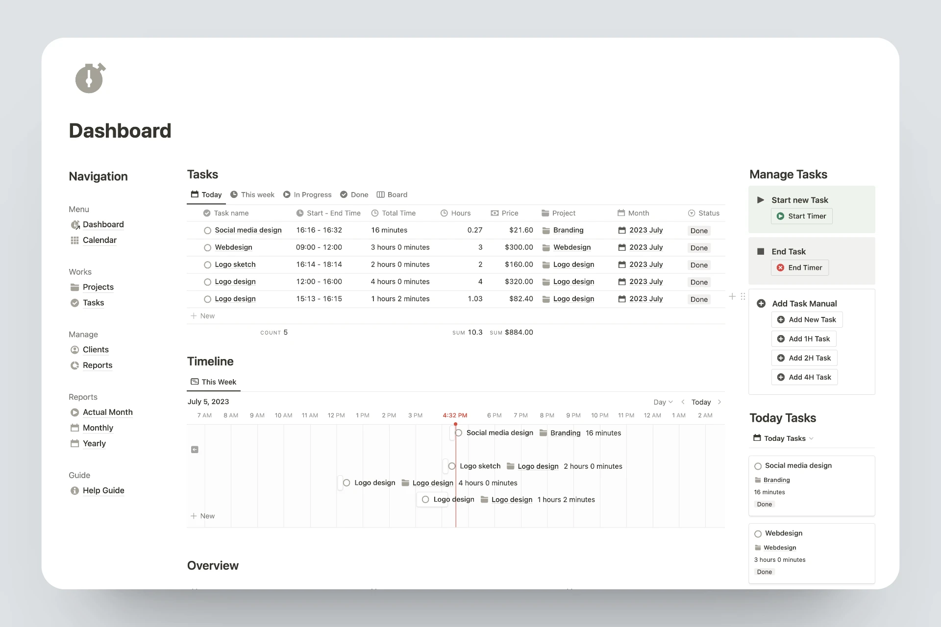 With this template, you can easily track your tasks, set estimated values for your projects, and monitor your progress with monthly, custom, and project reports.