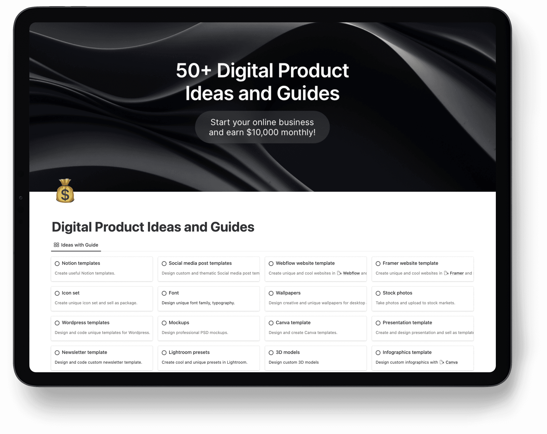 Unleash 50 digital product ideas with 200+ tools and resources to help you ditch the 9-5 grind and thrive as a full-time digital product creator. Step-by-step guides and templates included!
