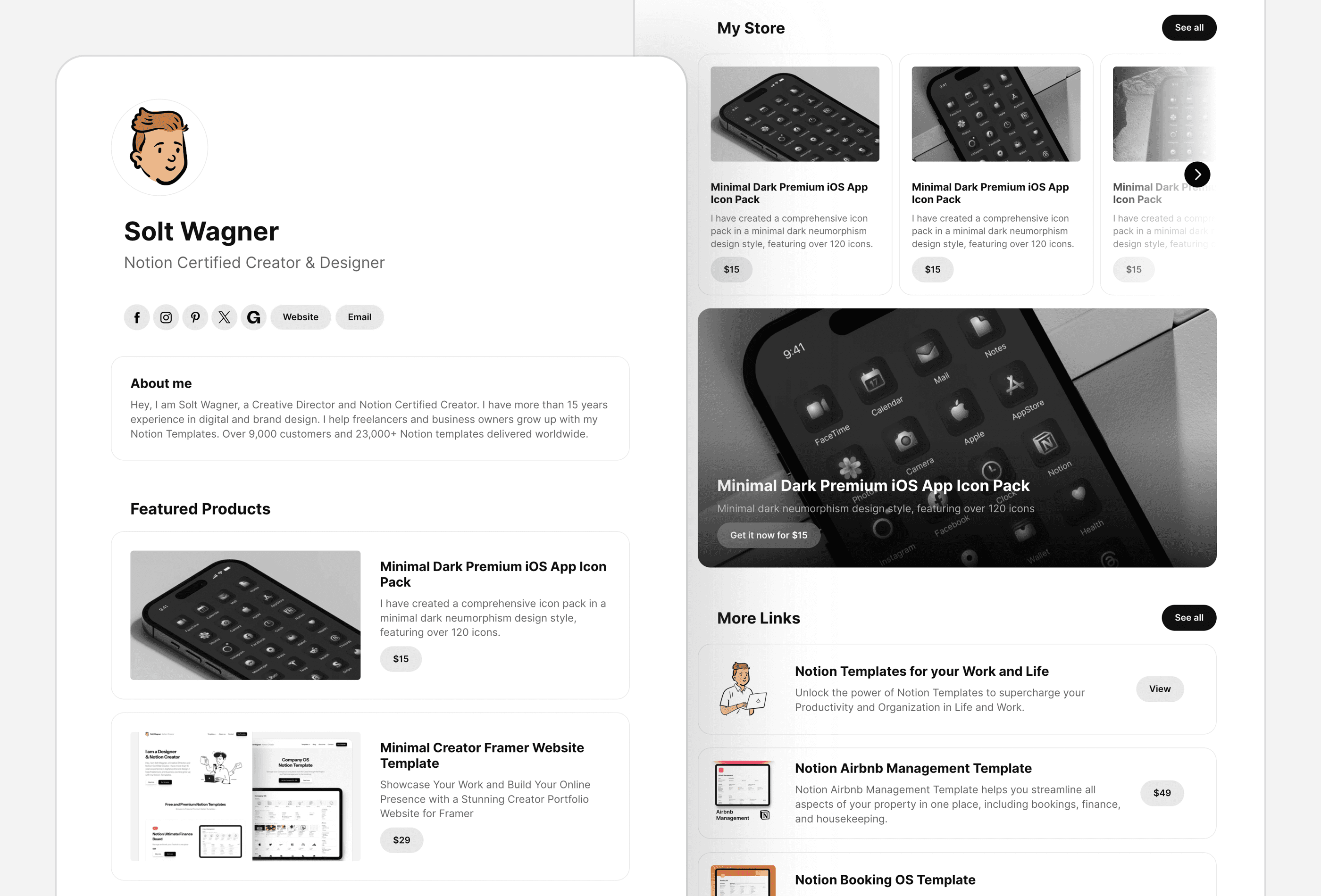 Notor is a customized landing page template for Notion creators. It enables you to quickly create a personalized landing page to promote and sell your Notion templates.