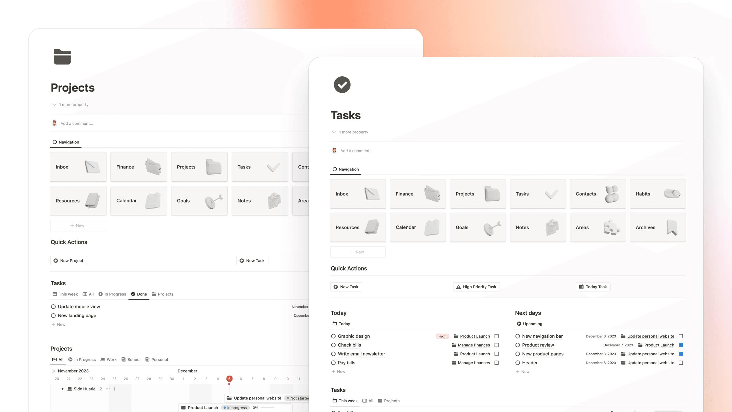 Take control of your life by capturing and organizing all your projects, tasks, notes, goals, finances, resources, events, contacts, and habits in one streamlined system.