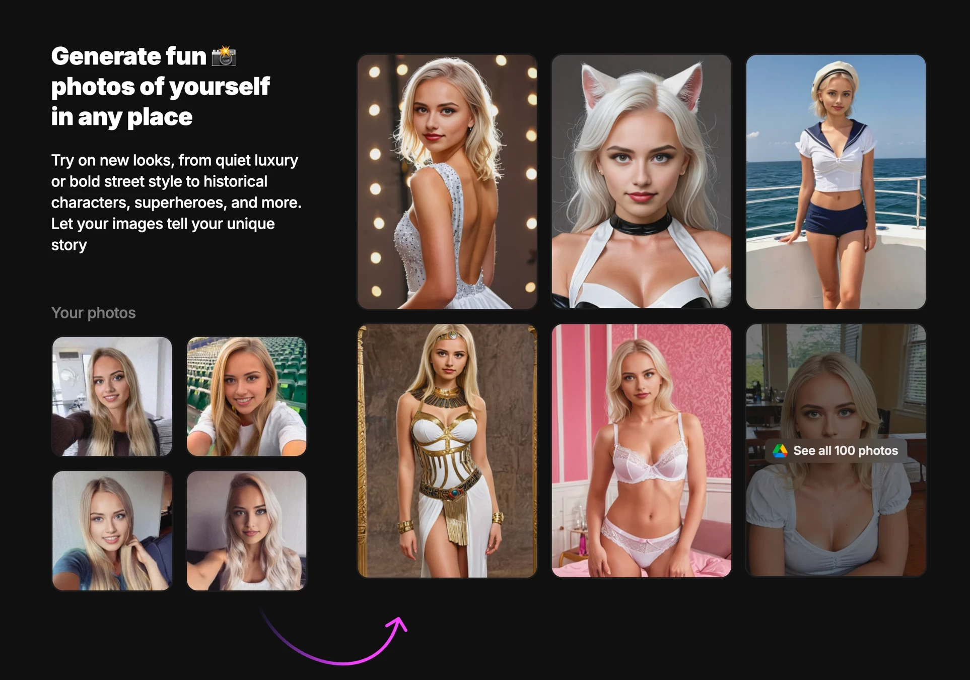 Generate your unique photos – In just a few seconds, receive AI-crafted images that look exactly like you in different settings and styles.