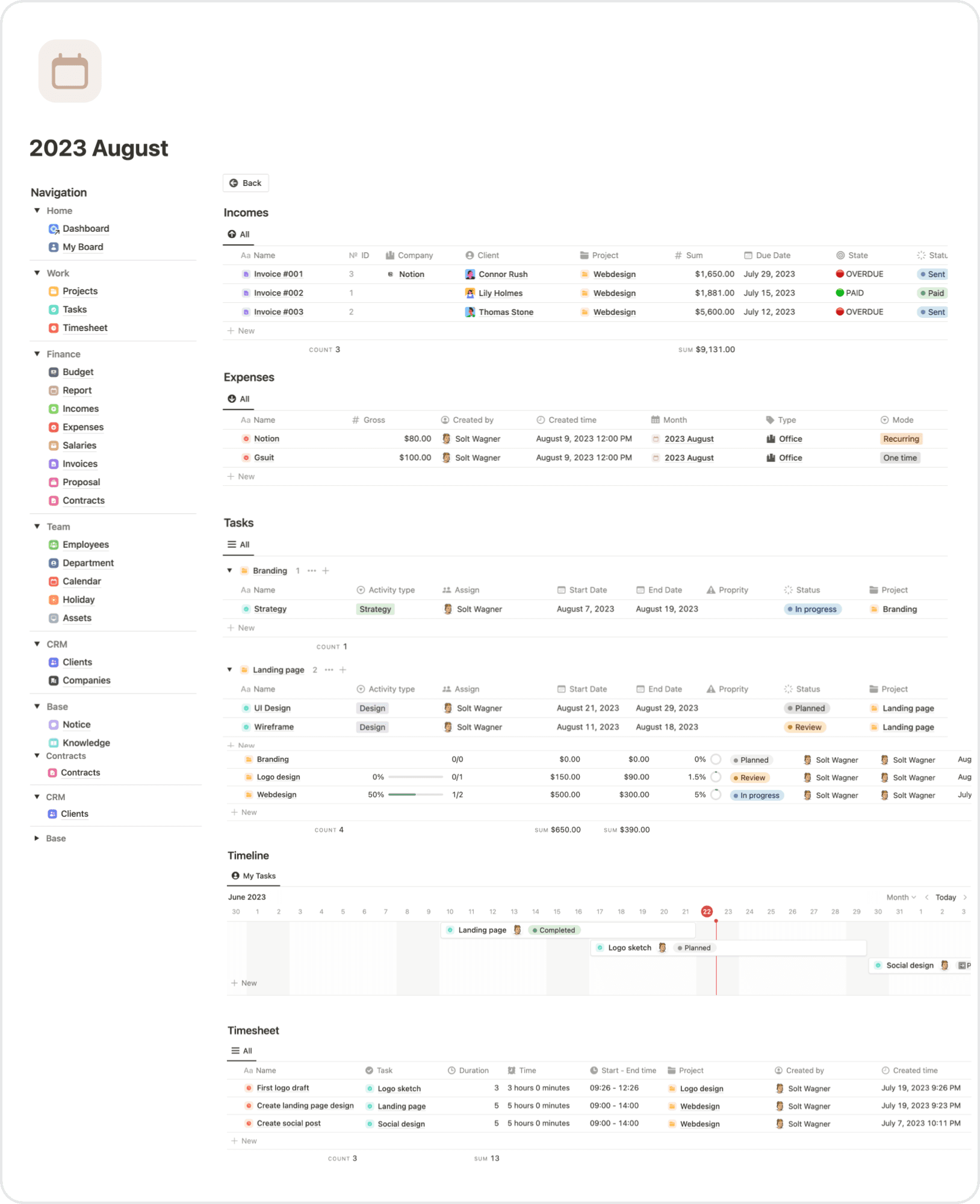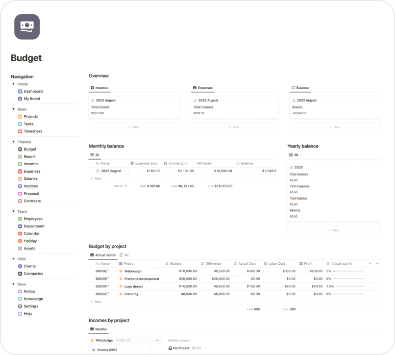 Monthly report for your Incomes, Expenses, Projects, Tasks and timesheet