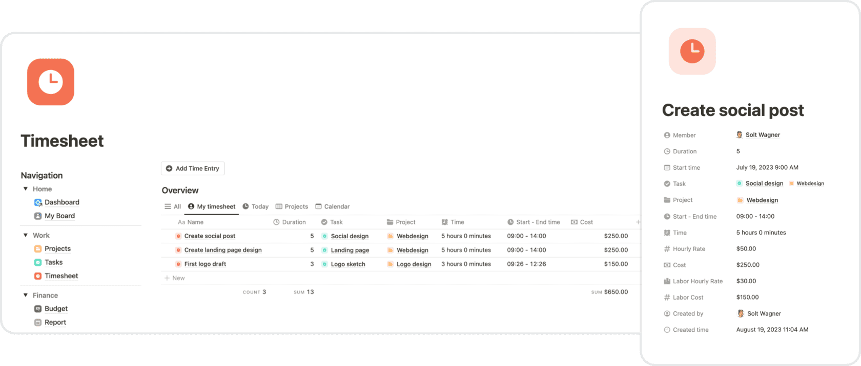 ✓ Timesheet, Time log